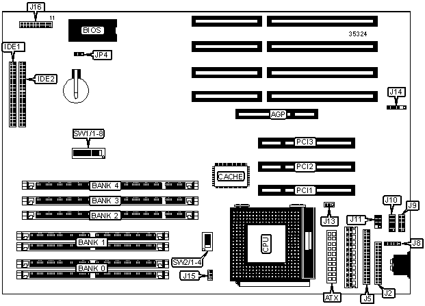 32-bit PCI slots (3), floppy drive interface, IDE interface (2), parallel port, PS/2 mouse port, serial ports (2), IR connector, AGP slot, USB connector |