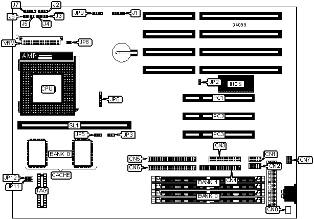 Note: Board accepts EDO memory. Board also accepts x 32 SIMMs. Banks are interchangeable. | ||