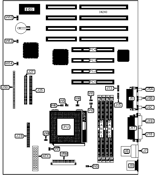 Note: If an AM K6 processor is installed, a VRM module must be installed. The jumper settings for W1 – W3 with a 75MHZ processor are unidentified. | |||||||
