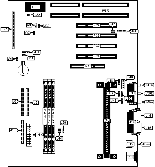 32-bit PCI slots (4), floppy drive interface, game/MIDI port, IDE interfaces (2), parallel port, PS/2 mouse port, serial ports (2), USB connectors (2), ATX power connector, AGP slot, line in, line out, microphone in, audio in – CD-ROM